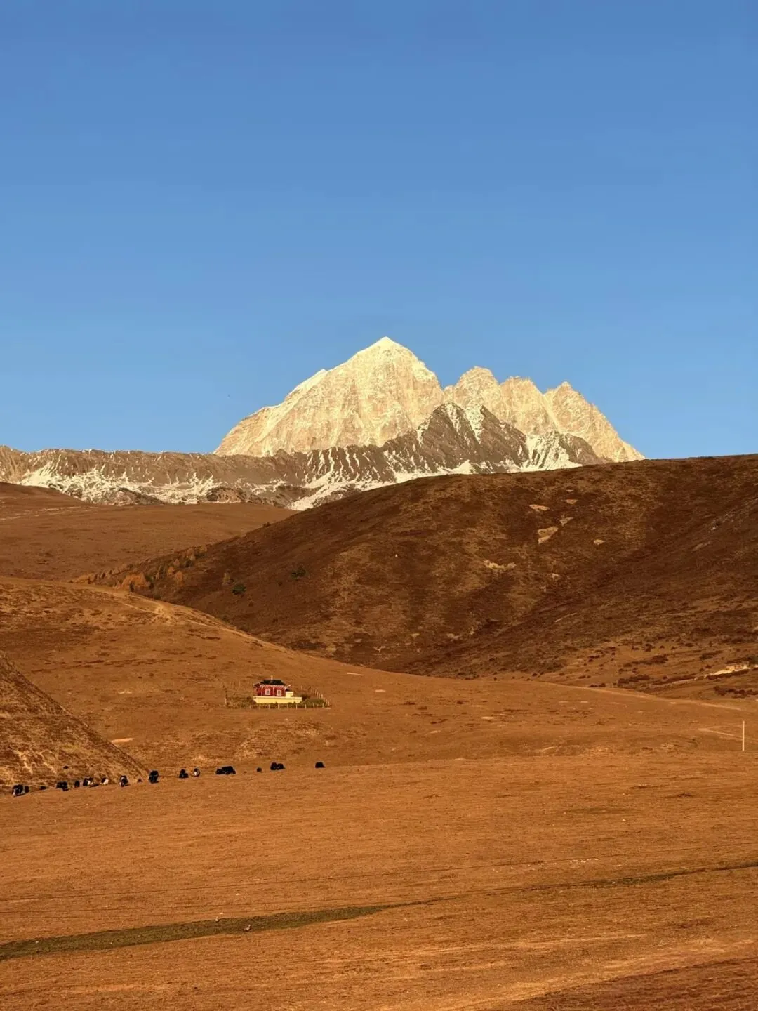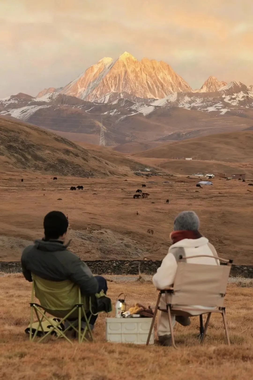 冬日里,金黄的草甸缀着零星小石子,潺潺溪水绕着矮坡打转,抬头就能望见亚拉雪山的银白峰峦,站在溪边,可以轻松拍出与雪山同框的照片,下午在这里晒着暖洋洋的太阳小憩,围炉煮茶,甚是惬意。