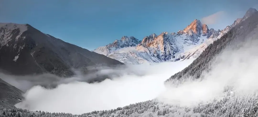 雪后的山峰银装素裹,云海在山间穿梭,时而淹没山峰,时而环绕半山,形成如梦如幻的景观。