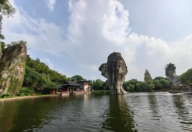 柯岩跟东湖一样也是采石场改造的,但规模更大,里面有云骨、鉴湖、鲁镇三个部分,云骨那块巨大的石柱是古代石工留下的,鉴湖就是绍兴黄酒的水源地,鲁镇是后来建的影视基地。这个景区厉害的地方在于它把历史、产业、文化全串起来了,不是生硬拼凑,是顺着绍兴这个城市本来的脉络走的。