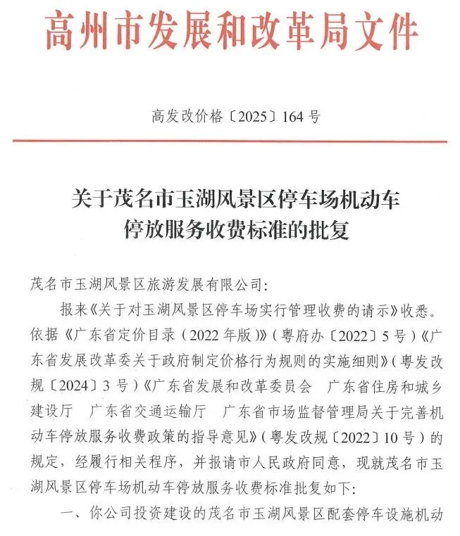 报来《关于对玉湖风景区停车场实行管理收费的请示》收悉。 依据《广东省定价目录(2022年版)》(粤府办〔2022〕5号)《广 东省发展改革委关于政府制定价格行为规则的实施细则》(粤发改 规〔2024〕3号)《广东省发展和改革委员会 广东省住房和城乡 建设厅 广东省交通运输厅 广东省市场监督管理局关于完善机 动车停放服务收费政策的指导意见》(粤发改规〔2022〕10号)的 规定,经履行相关程序,并报请市人民政府同意,现就茂名市玉 湖风景区停车场机动车停放服务收费标准批复如下: