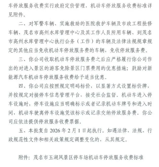 一 、你公司投资建设的茂名市玉湖风景区配套停车设施机动车停放服务收费实行政府定价管理,机动车停放服务收费标准详见附件。