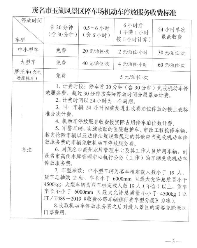 附件:茂名市玉湖风景区停车场机动车停放服务收费标准