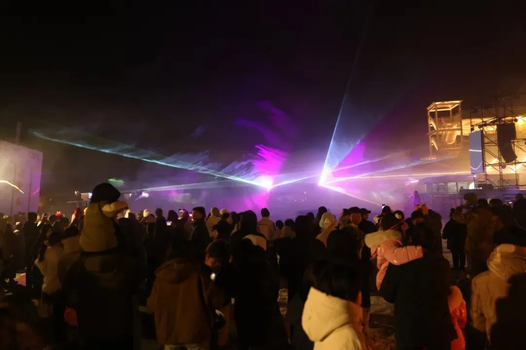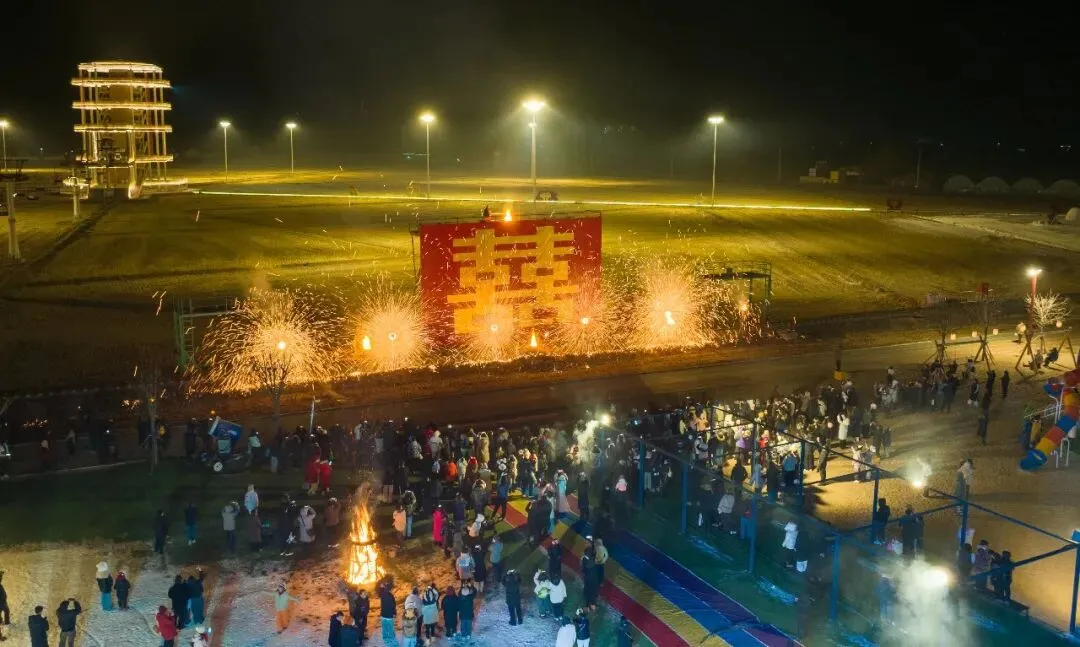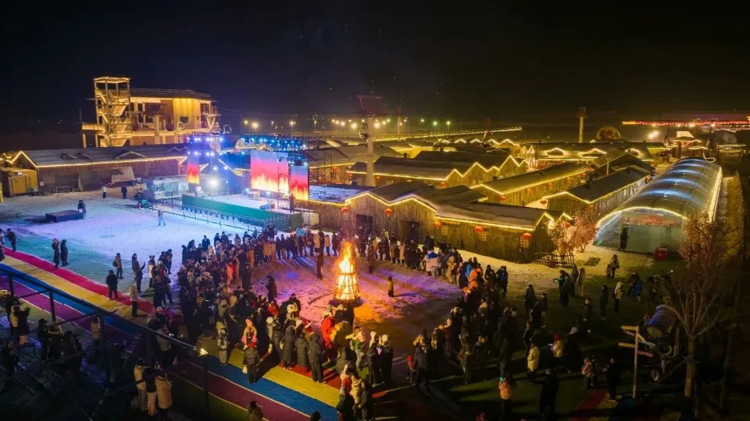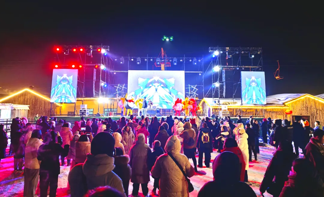 夜幕降临后,山里各庄则呈现出另一派生动景象。熊熊的篝火将现场映照得一片火红,激情四射的雪地狂欢派对与乡村土嗨舞蹈的奇妙组合,为游客带来视觉与听觉的欢乐盛宴。非遗打铁花技艺惊艳亮相,千点万点金花腾空绽放、璀璨下坠,引得游客惊叹不已。北极光光影秀点亮夜空,绚丽极光与皑皑白雪交相辉映,营造出如梦似幻的极地氛围感。“已经连续几年过来玩了,每年都有新鲜感,一家人玩得特别开心!”游客刘女士兴奋地说道。