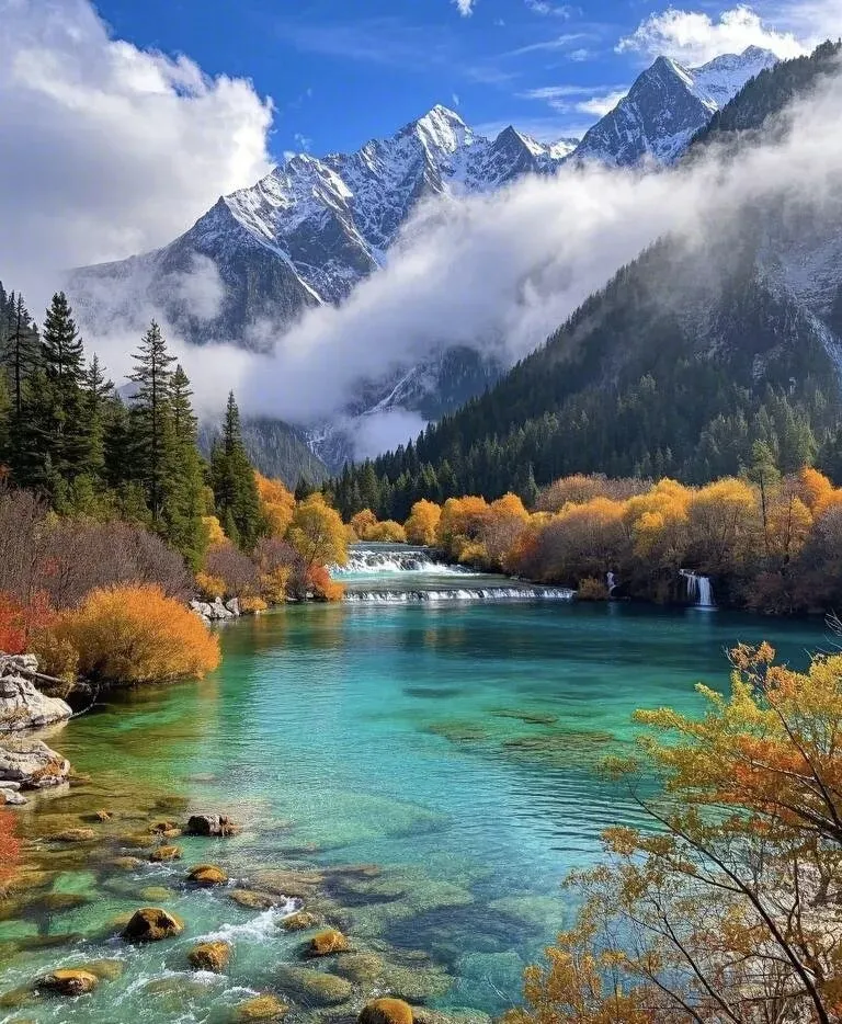 九寨沟,是大自然的调色盘,有“童话世界”的美誉。这里的湖水清澈见底,五彩斑斓,五花海、珍珠滩瀑布等景观令人陶醉。秋季时,彩林倒映在湖水中,美轮美奂,仿佛置身于“树树皆秋色,山山唯落晖”的梦幻之境。