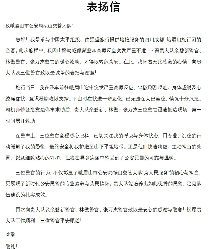 事后,获救游客怀着无比感激的心情,写下感谢信,向峨眉山市公安局致以最诚挚的表扬与谢意: