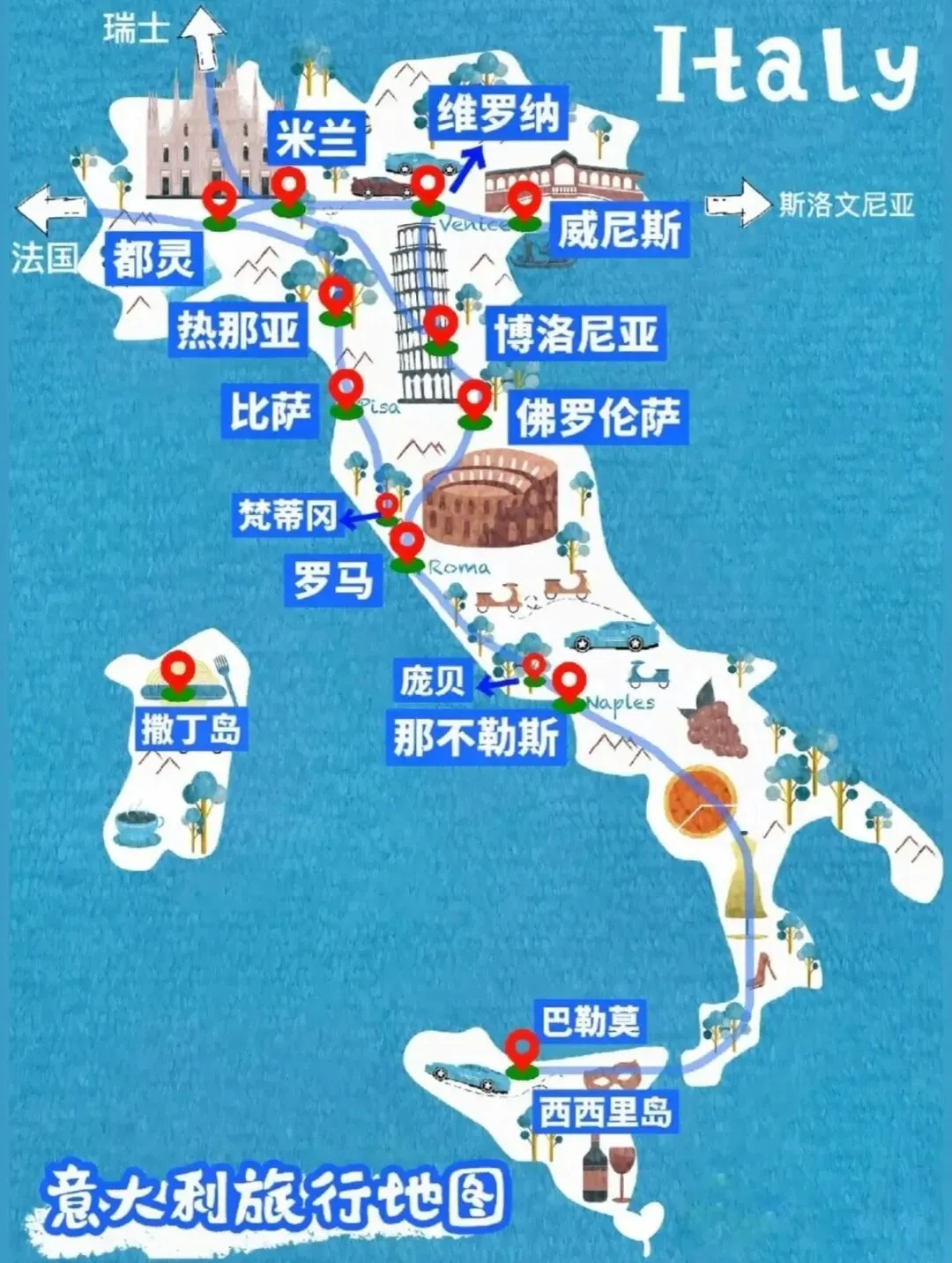 语言:意大利语,12种少数语言,差异大。小城镇英语普及率低。