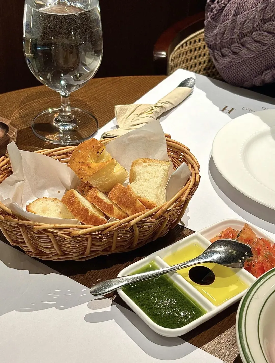 餐前面包配醋碟(橄榄油+黑醋),碳水配番茄酱。