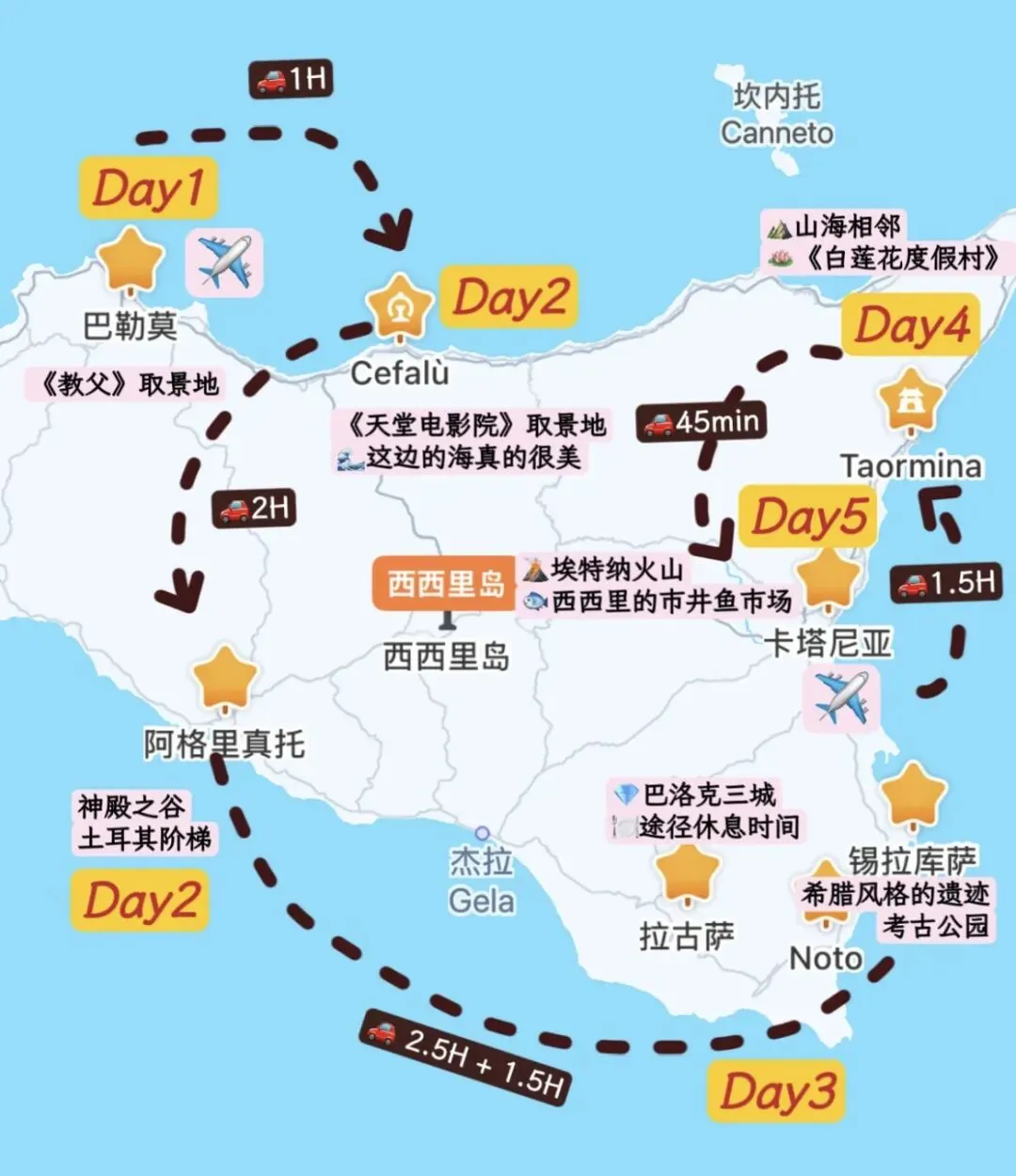 7-8日环岛:巴勒莫→切法卢→陶尔米纳*→埃特纳火山→卡塔尼亚→锡拉库萨*→诺托→阿格里真托→巴勒莫