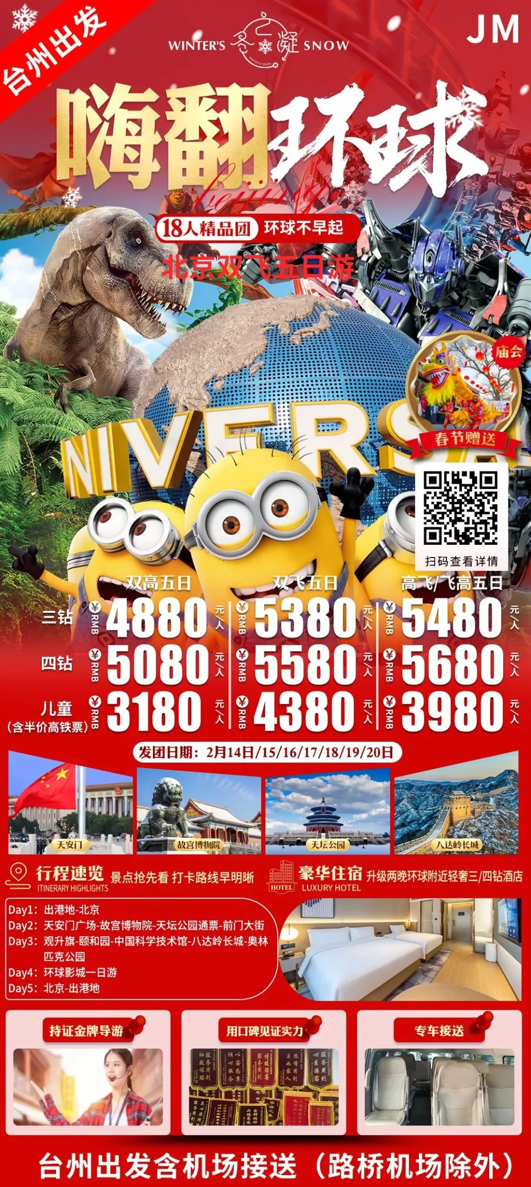 【大米旅游春节北京】 升国旗 故宫,八达岭长城,天坛,颐和园 .圆明园,科技馆 环球影视城 5日游(双飞动车均可)