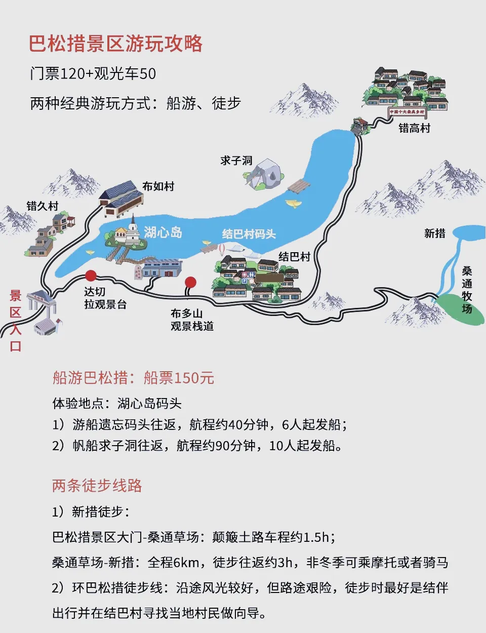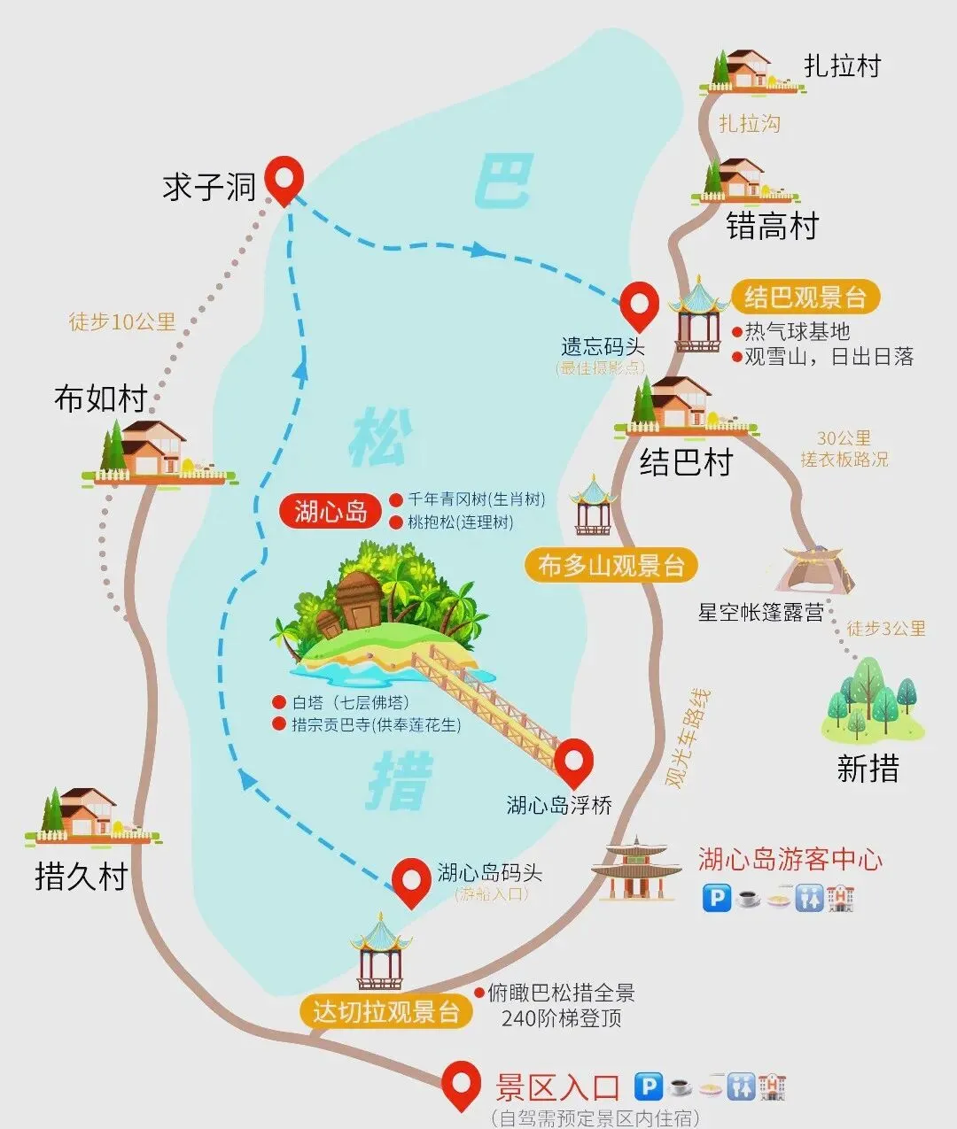 特色路线:新措轻徒步(单程约3公里,难度低)、湖心岛至遗忘码头游船(航程约40分钟)、环巴松措徒步(需向导陪同)。