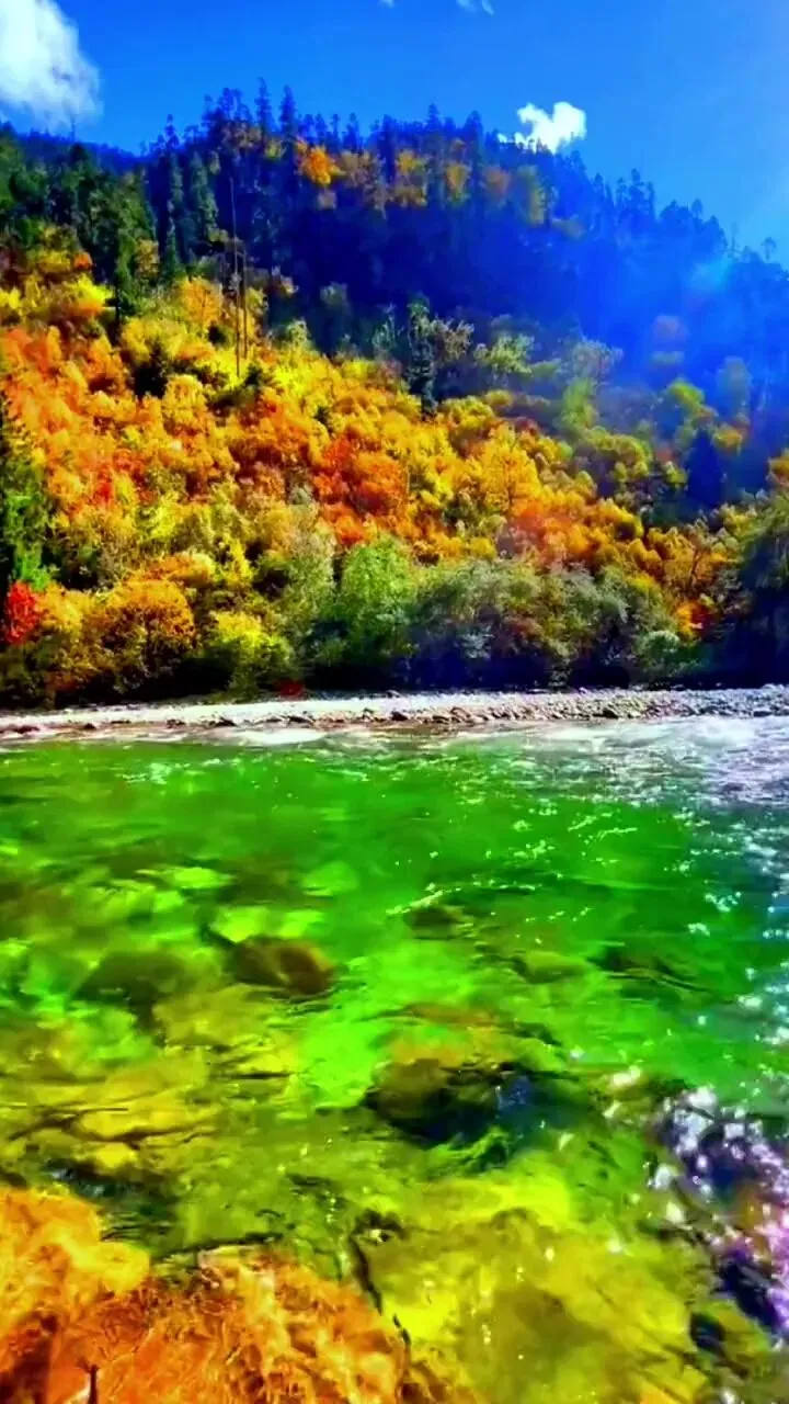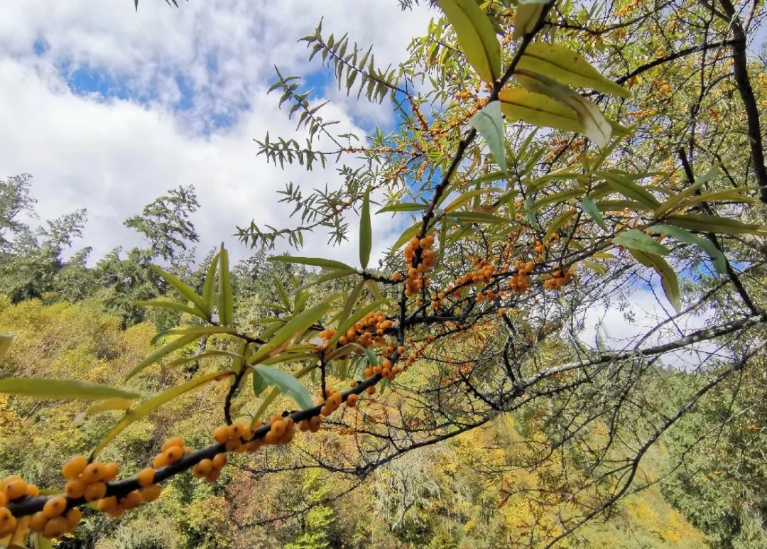 沙棘岛美景:位于南伊河中央的两座相邻小岛,岛上树木千姿百态,金黄的沙棘果与翡翠般的河水相映成趣,形成了"南伊之梦"的绝美画卷。