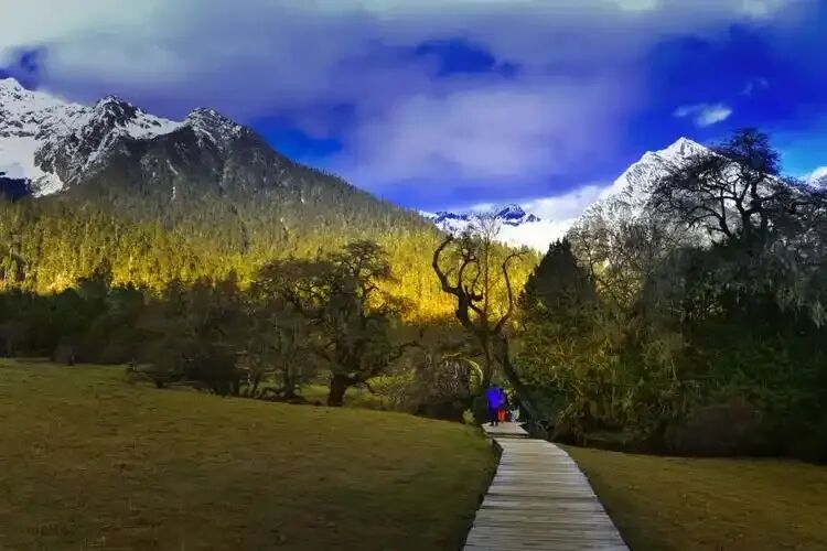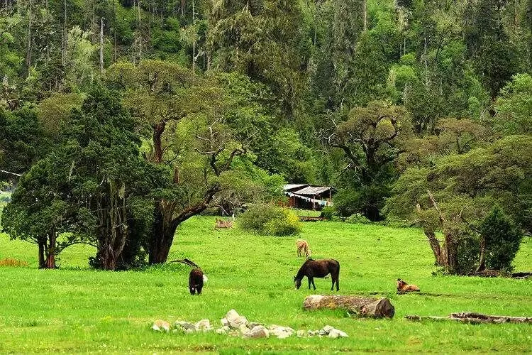 原始森林景观:沟内植被丰富,有造型奇特的各种树木,种子植物达720余种,其中松科植物占优势,包括高大的"米林云杉王"。