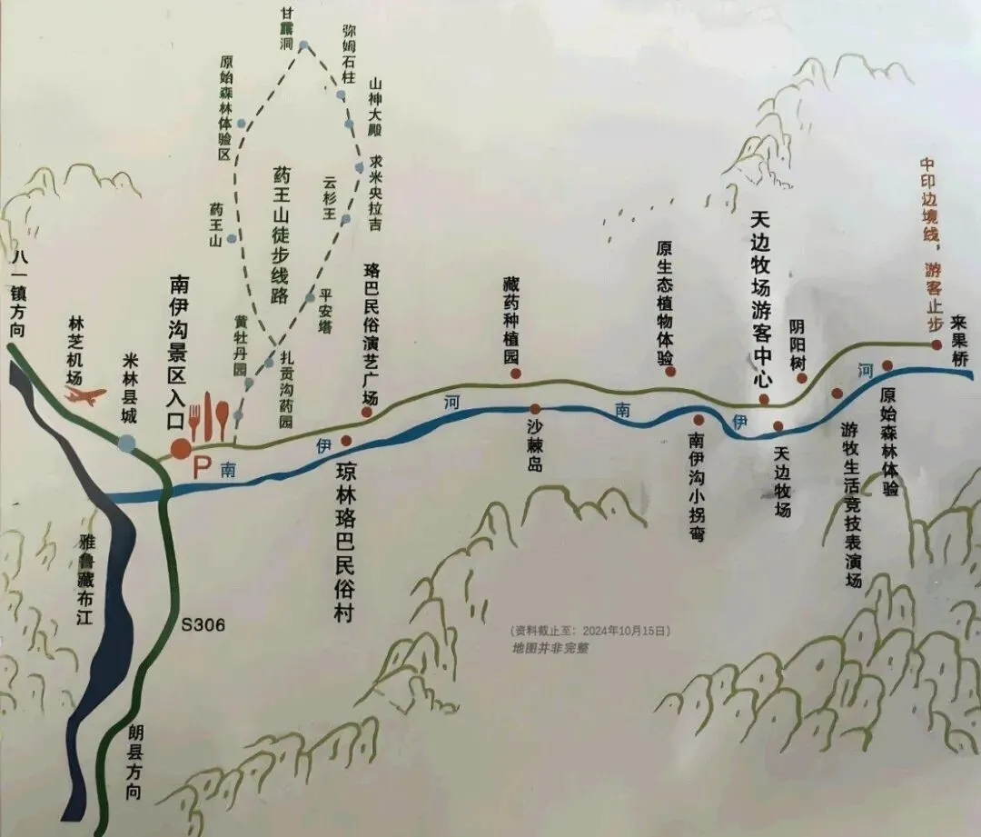 构成部分:景区主要由南伊沟主体和扎贡沟两部分组成,包括珞巴民俗村、沙棘岛、天边牧场、原始森林栈道、阴阳树等核心景点,形成了一条完整的生态与文化游览线路。