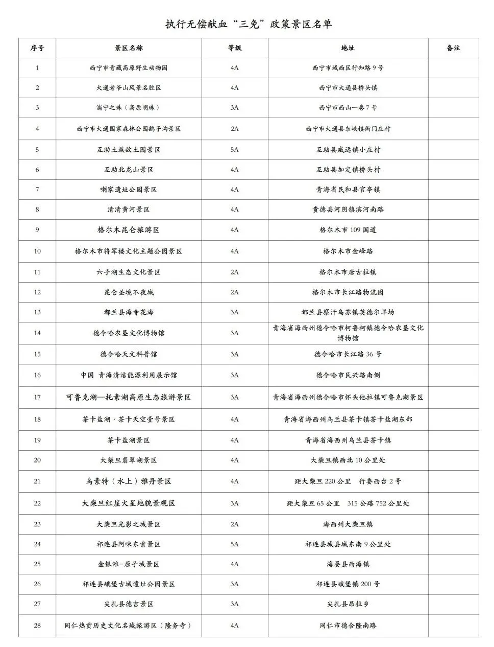为贯彻落实关于印发《青海省无偿献血“三免”政策实施细则》的通知(青卫健〔2024〕141号)要求,做好“三免”政策推进实施工作,即在青海献血量达4000毫升的无偿献血者,凭(已实名认证的)无偿献血电子献血证即可享受无偿献血“三免”政策景区名单内首道门票免费。现将落实上述政策的旅游景区名单公示如下: