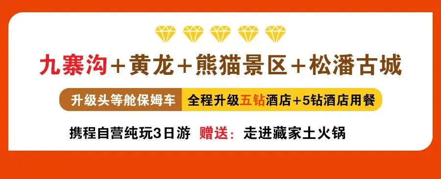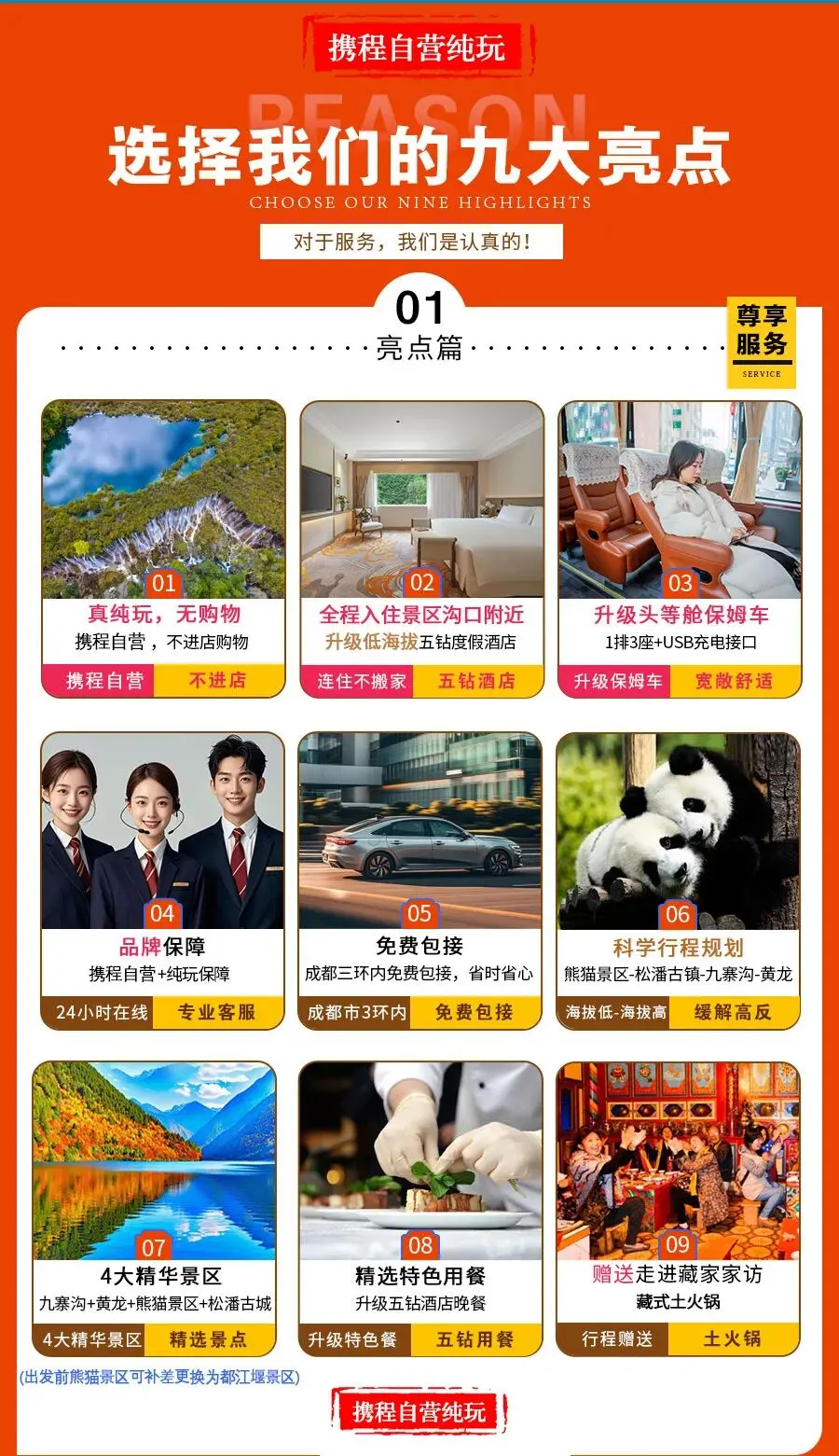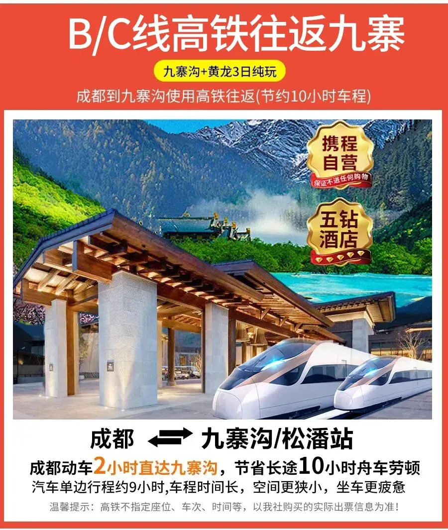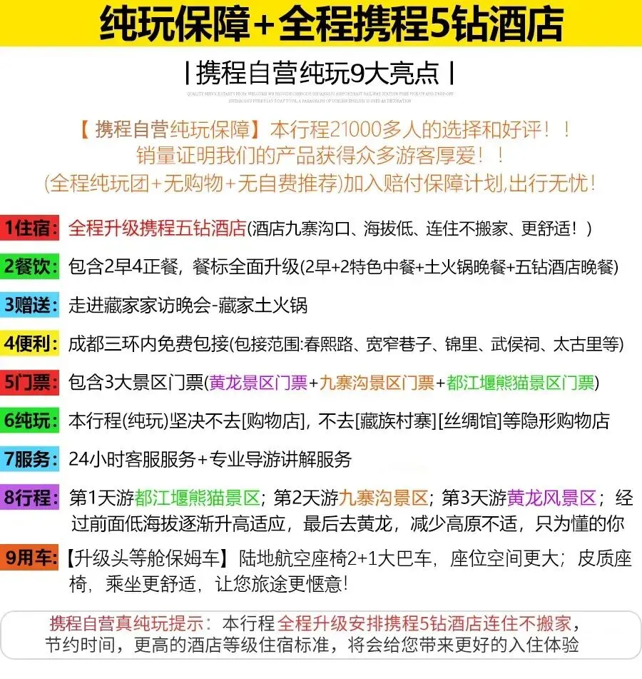 ★ 【服务保障】《携程自营真纯玩+5钻品牌度假酒店》含4大景区「九寨沟+黄龙+松潘古城+都江堰熊猫景区」 ★ 【缤纷体验】BD线 「成都高铁2小时直达九寨沟+头等舱保姆车+赠藏家晚会+5钻酒店晚餐+2万多人的出行选择 ★ 【精选酒店】升级品牌5钻度假酒店+5钻酒店晚餐,连住不搬家节约时间,九寨沟口低海拔+成都三环内免费接