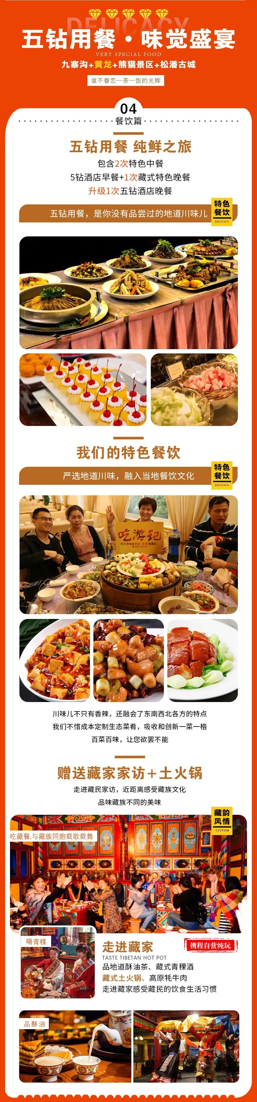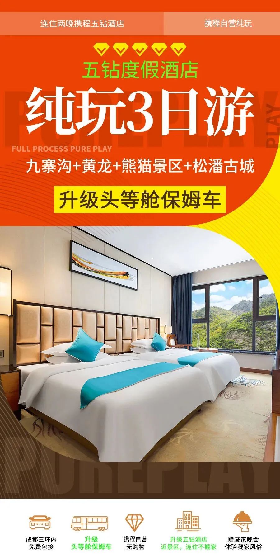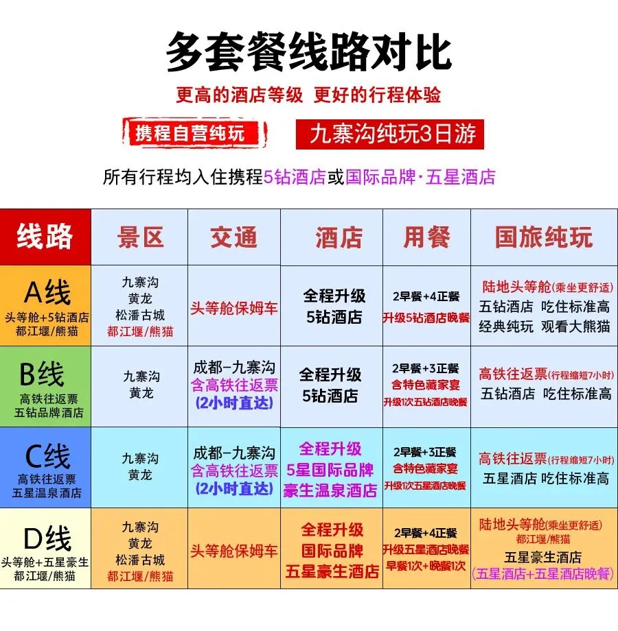 ★ 【服务保障】《携程自营真纯玩+5钻品牌度假酒店》含4大景区「九寨沟+黄龙+松潘古城+都江堰熊猫景区」 ★ 【缤纷体验】BD线 「成都高铁2小时直达九寨沟+头等舱保姆车+赠藏家晚会+5钻酒店晚餐+2万多人的出行选择 ★ 【精选酒店】升级品牌5钻度假酒店+5钻酒店晚餐,连住不搬家节约时间,九寨沟口低海拔+成都三环内免费接