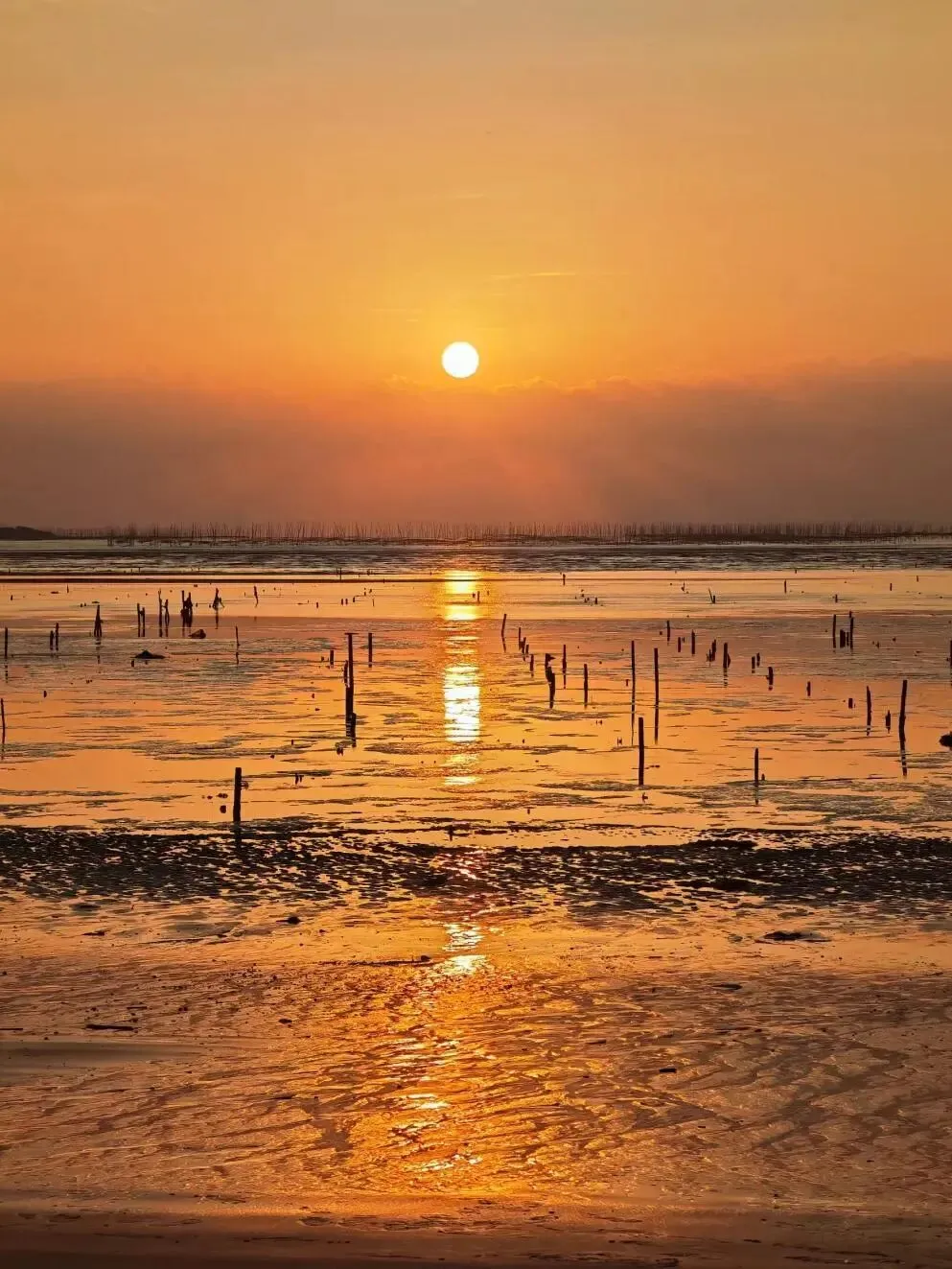 滩涂在夕阳下呈现出不同的纹理和色彩, 每一帧都像是电影画面 。我在东壁村待了整整一个下午,看渔民撒网的身影与日落融为一体。