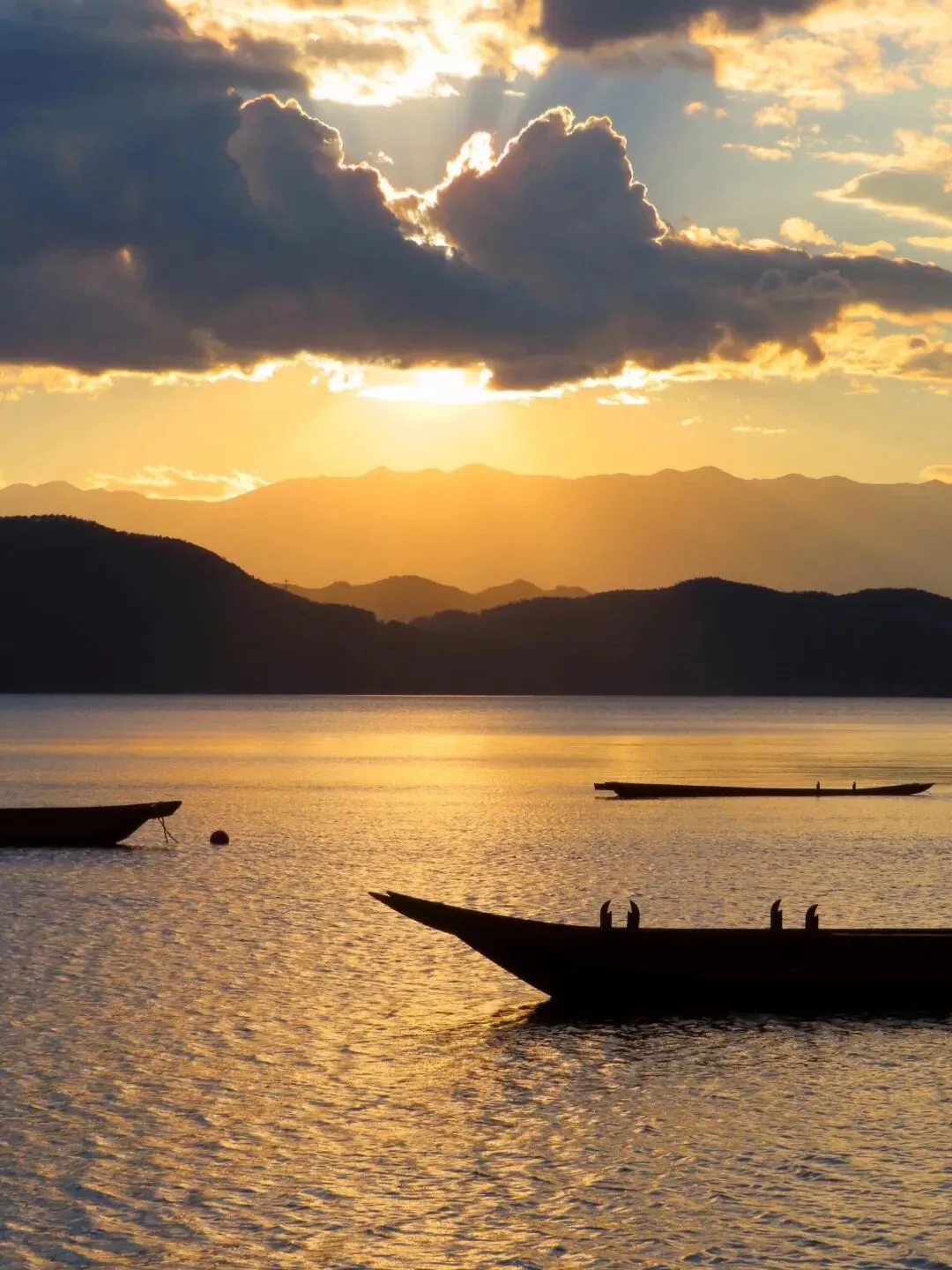 湖面平静得像镜子,群山环绕, 夕阳洒在湖面上就是满湖金辉 。我当时坐着猪槽船在湖中央看日落,那种感觉就像是被整个世界温柔包围。