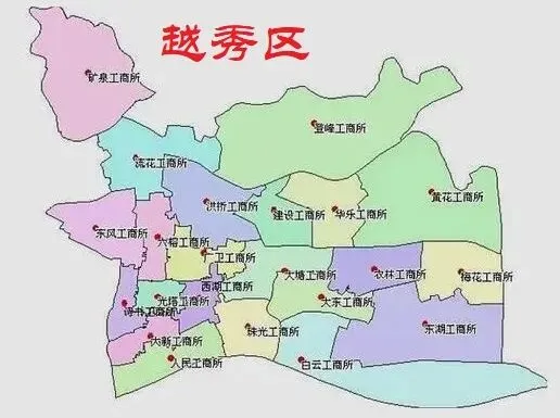 越秀区辖18个街道:洪桥街道、北京街道、六榕街道、流花街道、光塔街道、人民街道、东山街道、农林街道、梅花村街道、黄花岗街道、华乐街道、建设街道、大塘街道、珠光街道、大东街道、白云街道、登峰街道、矿泉街道,区政府驻越华路。