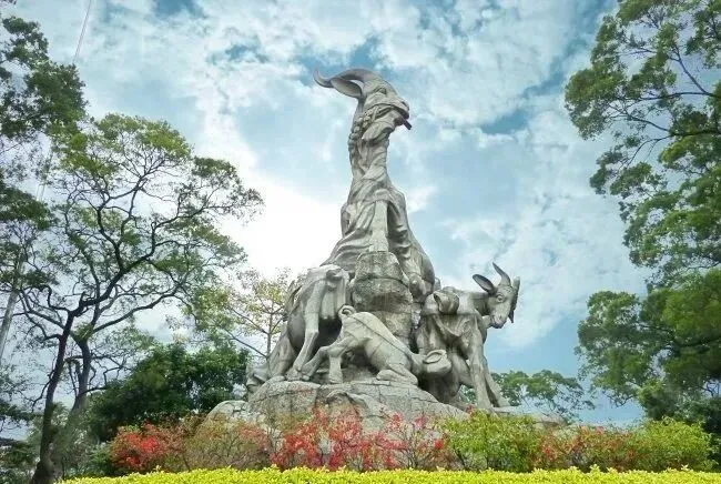 是由尹积昌、陈本宗、孔繁纬创作的花岗岩城市雕塑,始建于1960年4月,位于广州市越秀公园内的越秀山木壳岗。《五羊石像》整个石像连基座高11米。主羊头部高高昂起,口中衔穗,回眸微笑,其余四羊环绕于主羊周围,或戏耍,或吃草。五羊大小不一,姿态各异,造型优美,已经成为广州城市的标志。