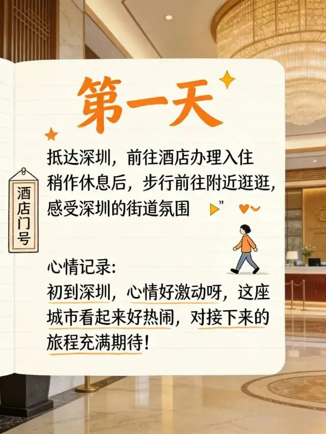 - 心情记录:初到深圳,心情好激动呀,这座城市看起来好热闹,对接下来的旅程充满期待!