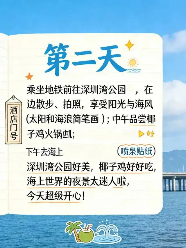 - 乘坐地铁前往深圳湾公园🌊,在海边散步、拍照,享受阳光与海风(可以画个太阳和海浪的简笔画)。
