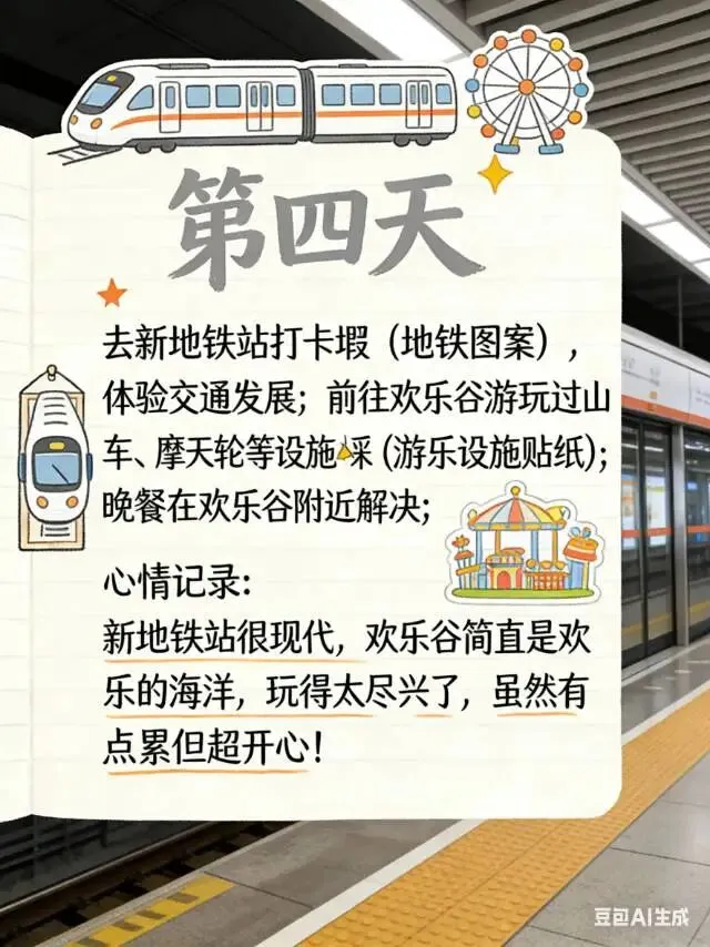- 心情记录:新地铁站很现代,欢乐谷简直是欢乐的海洋,玩得太尽兴了,虽然有点累但超开心!
