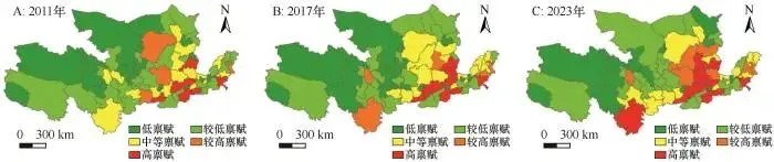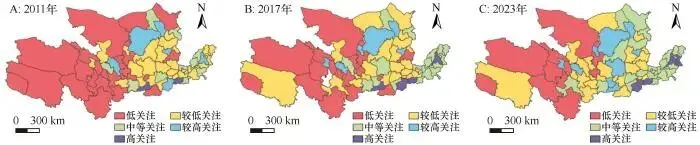 Fig.9 Spatial differentiation of compatibility among tourism resource endowment, tourism economy, and tourism network attention in the Yellow River Basin from 2011 to 2023
