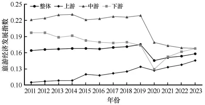 2011—2023年黄河流域旅游经济水平经历了先波动上升后骤降的变化过程,旅游经济发展指数由2011年的0.164增长至2019年的0.175,但受新冠肺炎疫情影响,2020年骤降至0.145,2023年略有回升,恢复至0.158(图4)。分流域段来看,中游地区的旅游经济始终高于全流域平均水平,指数由2011年的0.221提升至2019年的0.229,2020年降至0.179,2023年又降至0.168,较2011年下降23.98%;下游地区虽高于全流域平均水平,但呈现缓慢下降趋势,2023年指数为0.168,较2011年下降14.72%。上游地区旅游经济水平最低,但逐步提升,指数由0.105增至2023年的0.146,增幅为39.05%。