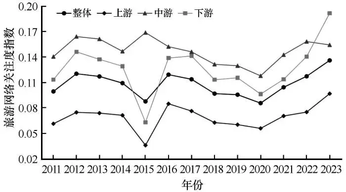2011—2023年黄河流域旅游网络关注度呈波动上升趋势,指数由0.099增至0.136(图6),表明旅游吸引力和市场影响力逐步提升,但年均值仅为0.108,整体增幅有限。分流域段来看,中游地区旅游网络关注度始终高于全流域平均水平,指数由0.140增至0.154,增幅为10%,下游地区除2015年外,其他年份均高于全流域平均水平,并且凭借丰富的旅游资源和完善的基础设施,指数由0.113增至0.191,增幅达到69.03%。上游地区的关注度较低,指数从0.061增至0.097,增幅为59.02%。