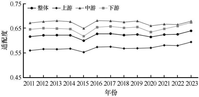 流域适配度总体小幅提升,处于“较适配”状态,中游表现最佳,上游最弱。空间格局呈东高西低倒“T”形分布,城市间适配度分化明显,集中组团趋势增强。
