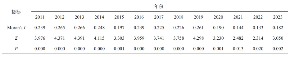 为揭示黄河流域旅游资源、旅游经济与旅游网络关注度适配度的空间关联特征,选取2011—2023年69个市(州、盟)的适配度指数,采用全局Moran's I进行空间自相关分析。结果显示,Moran's I值为0.133~0.266,P值均小于0.02,表明适配度具有显著空间集聚性,但整体呈减弱趋势(表2)。分时段来看,2011—2019年Moran's I值持续上升,表明空间集聚性增强;2020年受新冠疫情影响,Moran's I值降至2022年的0.133,空间集聚效应显著削弱,2023年略有回升至0.182。这表明疫情对区域旅游系统的空间协同格局造成短期扰动,区域适配格局逐步向分散化演变。