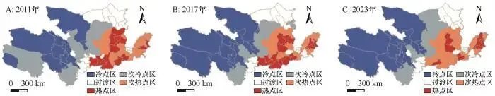 Fig.10 The hot/cold spot spatial pattern of compatibility among tourism resource endowment, tourism economy, and tourism network attention in the Yellow River Basin from 2011 to 2023