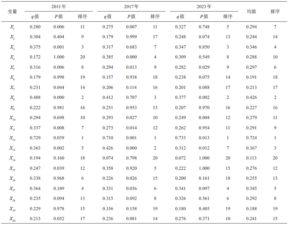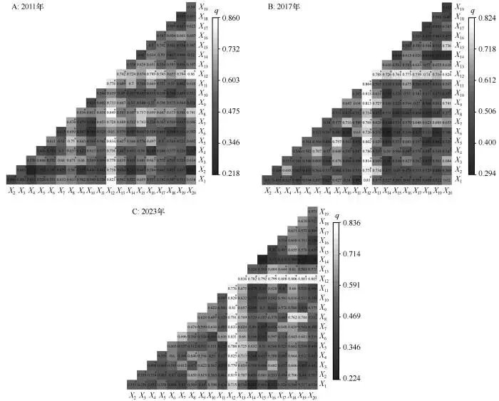 基于地理探测器分析,识别了2011—2023年黄河流域旅游资源禀赋、旅游经济与旅游网络关注度适配度集聚与演化的关键因素(表4)。探测结果表明,不同年份主导影响因子的q值及排名有所变化。2011年主导因子为X12、X8、X3,q值分别为0.729、0.488、0.375;2017年主导因子为X12、X13、X8、X4、X15,q值分别是0.710、0.426、0.412、0.385、0.358;2023年主导因子为X12和X8,q值分别是0.733、0.377。总体来看,X12、X8、X13、X3、X17、X5是2011—2023年适配度集聚与演化的主要影响因素,平均q值分别为0.724、0.426、0.367、0.346、0.345、0.297,反映了财政投入、生态环境、经济发展等因素在空间适配中的关键作用。