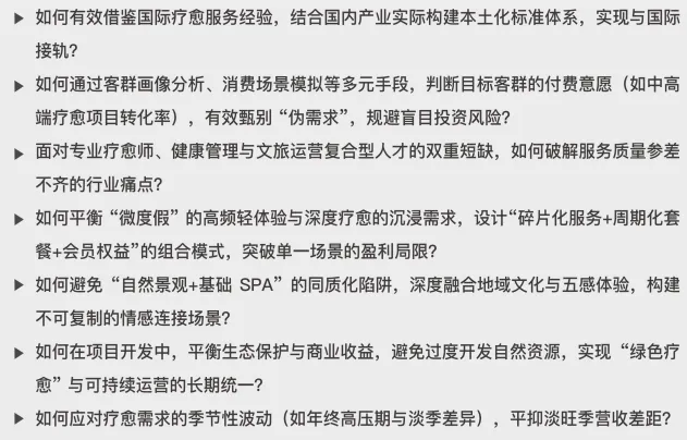 产业链整合放大效益: 联动本地资源(药材、艺术、生态、温泉)、专业机构(医疗、艺术治疗)及上下游产业,形成共生共赢的生态圈。