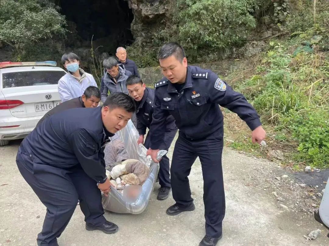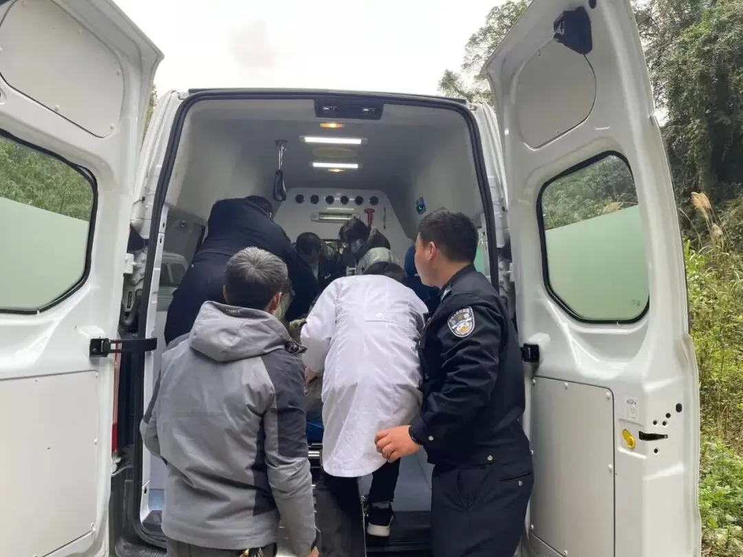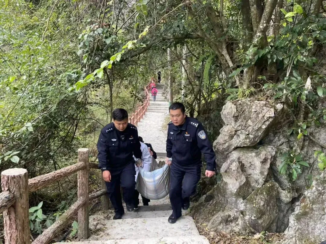 山间寒风凛冽,民辅警们的脸颊被吹得通红,双手因抓握被子一角而用力到发白,却没有人喊累。经过半个多小时的艰难转运,终于将游客安全送达山脚,顺利移交医护人员送往凤山县人民医院救治。