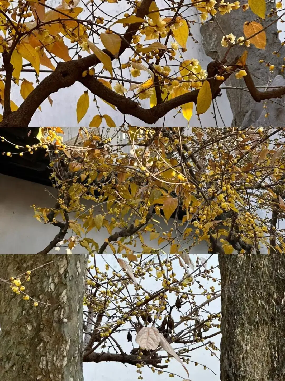 最早看到是拙政园靠近嘉实亭旁那株,花开了很多,但是被黄叶覆盖,当时一位摄影大哥拿着相机左三圈右三圈在那找角度,旁边心急的阿姨已经踮起脚尖捡下枝头落败的枯叶,一边轻轻地拿,一边喃喃自语“苏州的栀子花还真香”,树下的小姑娘大概是古诗打卡,赶紧纠正这是寒冬里的傲骨蜡梅。