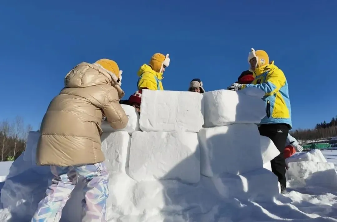 踏入景区,仿佛走进沉浸式的冰雪童话。孩子们化身为“雪境建筑师”,以方正雪砖为材料,亲手搭建属于自己的雪屋。指尖翻飞间,一座座造型各异的雪屋悄然立起,或圆润可爱,或棱角分明,成为林海雪原间灵动的风景。家长与孩子携手合影,镜头中定格了协作的默契与成功的喜悦,亲子之情在雪野中静静流淌。