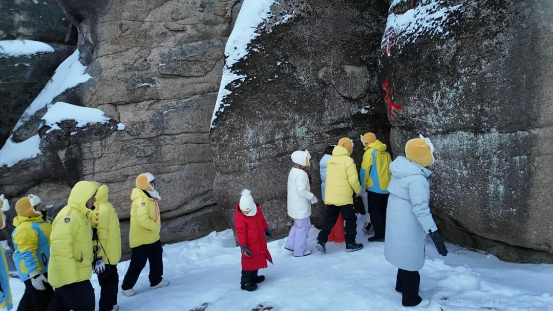 稍作休整后,研学团队深入景区,探访“树在石上、石在林中”的地质奇观。一线天的冰挂如水晶幕帘垂落,折射出斑斓光彩;主题标志石覆雪屹立,展现着亿万年地质的沧桑。孩子们驻足观赏,用镜头记录奇石与雪景的交融,在大自然的鬼斧神工中,悄悄埋下了探索的种子。