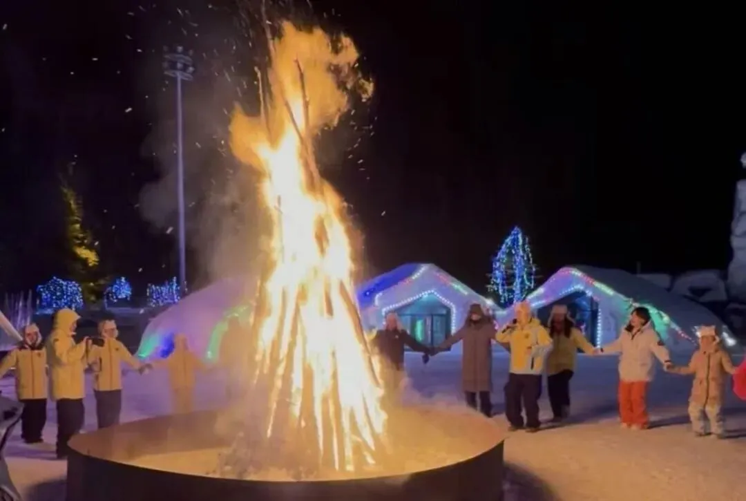 晚餐后,篝火燃起,橘红的火光点亮夜色。孩子们手拉手围火欢歌,笑声与歌声将气氛推向高潮,让冰雪中的温暖记忆更加鲜活。