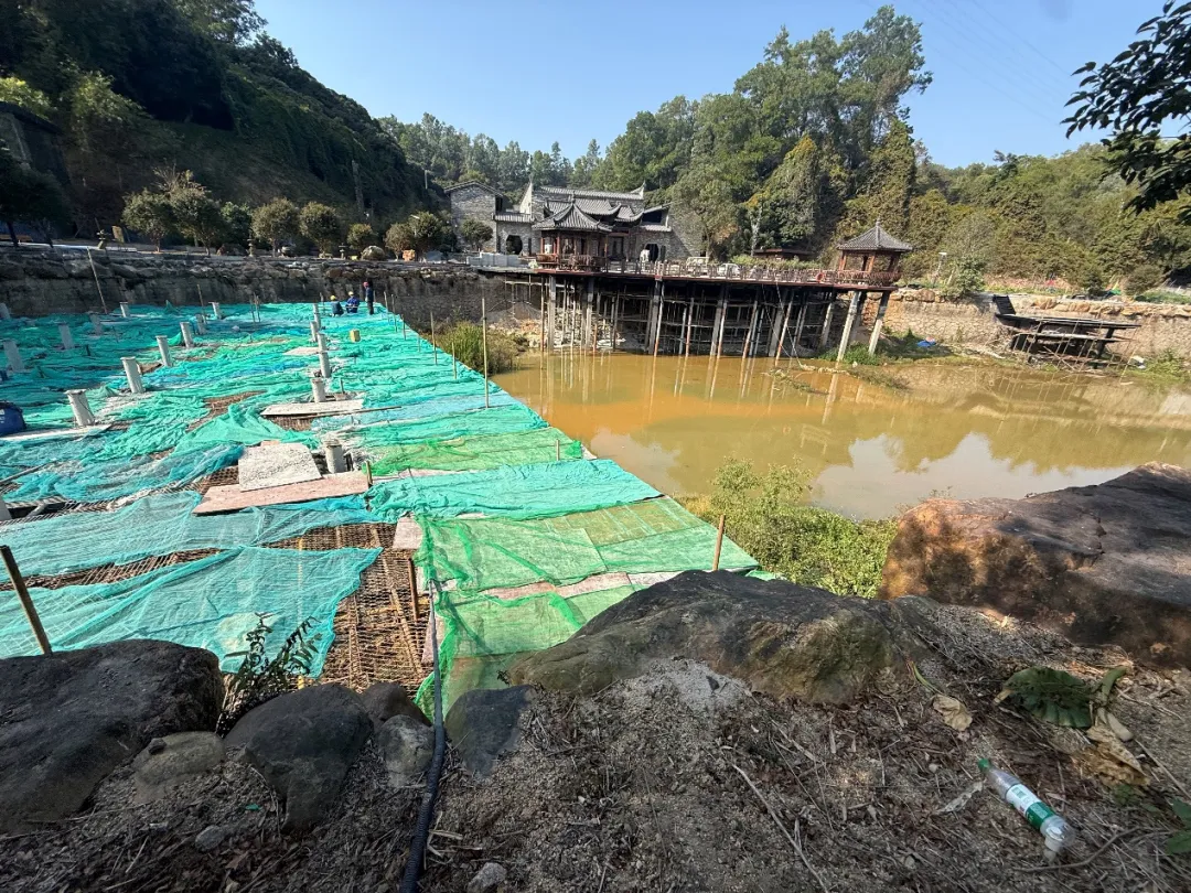 记者继续往里走约20米处,看到有一方水塘,水塘一侧架设大量钢筋柱子,其上铺设大面积蓝绿色施工防护网,有工人在其中焊接钢筋。现场未见工程备案公示信息。