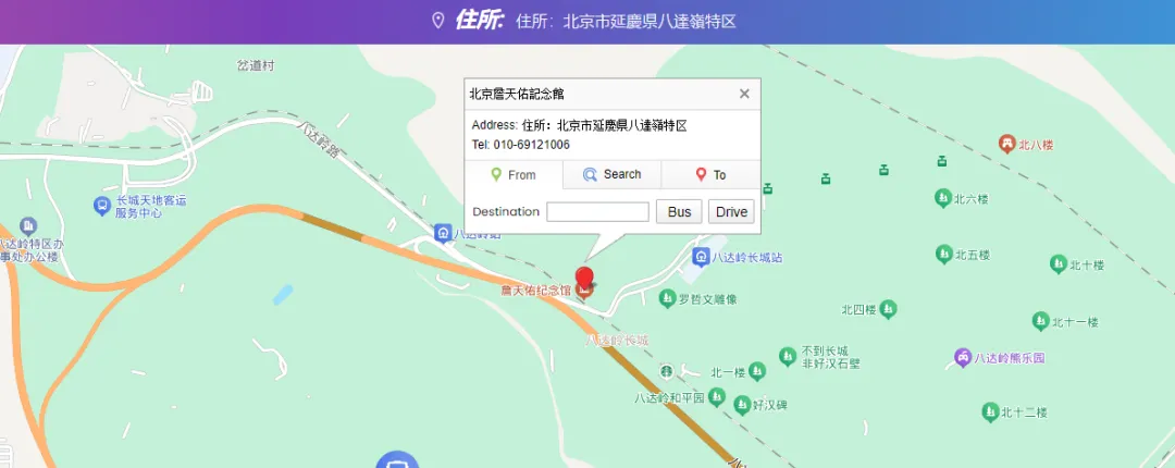 北京詹天佑記念館 詹天佑記念館は、延慶区八達嶺長城の北側に位置し、中国近代鉄道建設史において傑出した貢献をした愛国者、詹天佑を記念するために建てられた専門人物記念館である。1987年11月に建設され、公開された。記念館は、瞻仰ホール、序幕ホールそして3つの展示ホールからなり、詹天佑が学び、鉄道建設に尽力し、清朝と戦い、辛亥革命を支持した経過を紹介している。また、詹天佑が使用した測量器具、道具、印章、勲章、京張鉄道の建設道具なども展示されている。 北京詹天佑纪念馆 詹天佑纪念馆位于延庆区八达岭长城北侧,是为纪念在中国近代铁路建设史上做出杰出贡献的爱国者詹天佑而建立的专题人物纪念馆。该馆于 1987 年 11 月建成并对外开放。纪念馆由瞻仰厅、序幕厅以及三个展厅组成,介绍了詹天佑求学、投身铁路建设、在清朝时期奋斗以及支持辛亥革命的历程。馆内还展出了詹天佑使用过的测量仪器、工具、印章、勋章以及京张铁路的建设工具等物品。