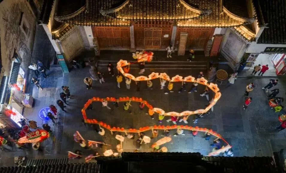 夜幕降临,百鱼齐游,锣鼓喧天,鱼身随鼓点起伏摆动,宛如水下银河穿梭在青石板巷,灯光映红一张张笑脸,热闹得像穿越回古代灯会。