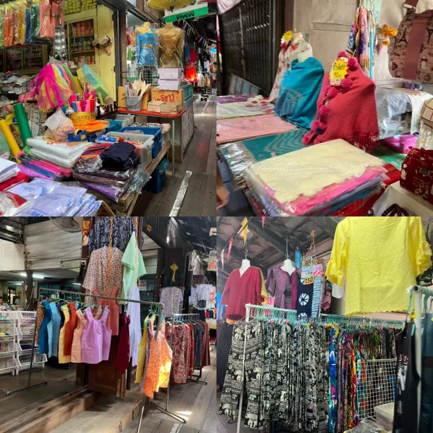 既然是复古水上市场,当然少不了各式各样的怀旧服装。如果是和爷爷奶奶一起来,保证他们会眼睛一亮、逛得超开心!这里有泰式传统服装、纱笼(ผ้าถุง)、无袖家居上衣(คอกระเช้า),还有各类布料、成衣布可以选购。