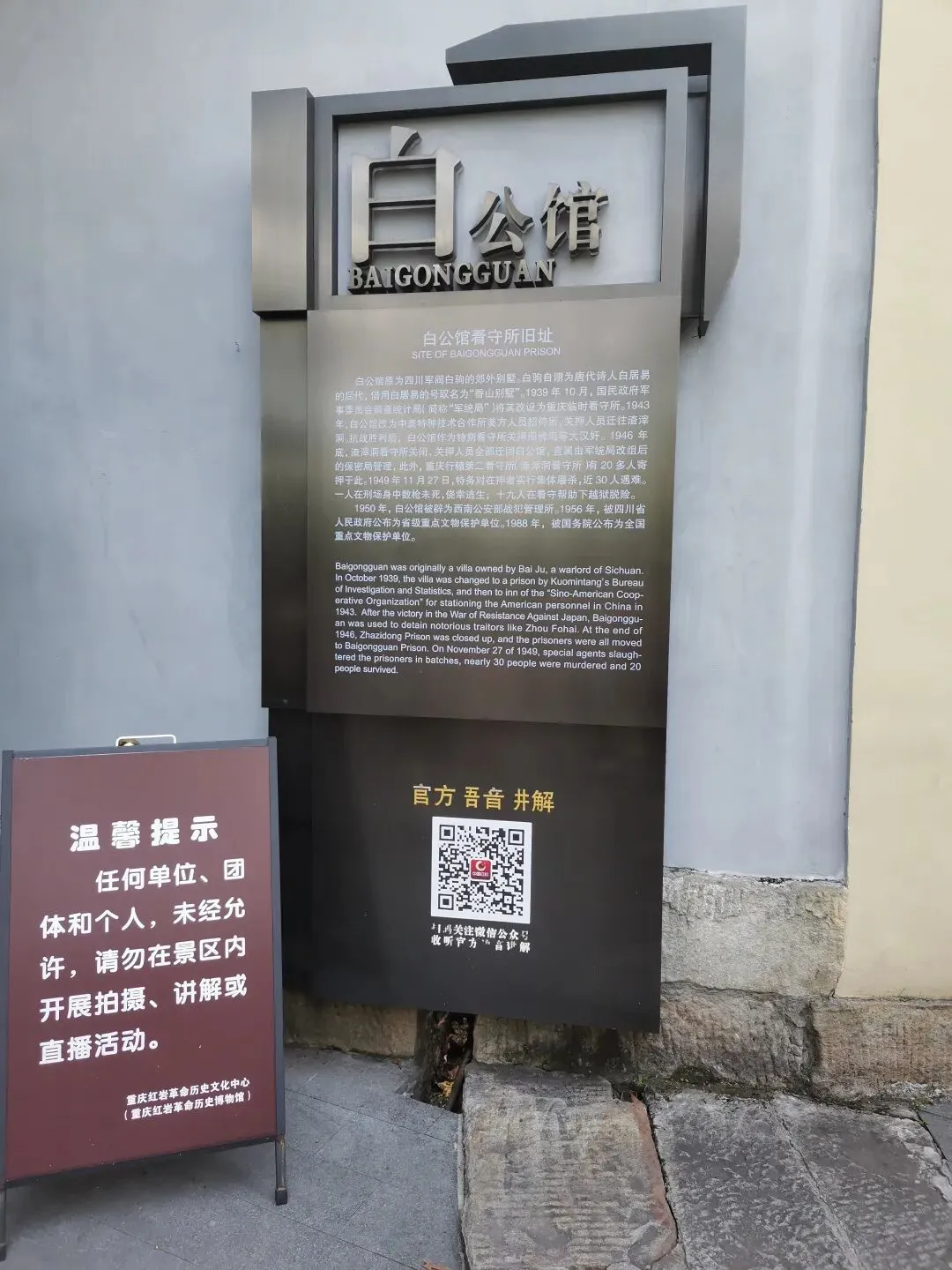 接着打卡华严寺、白公馆。到白公馆手机完全没电关机了。晚上聊天,竟然忘了给充电宝充电,偏又没带充电器,准备租充电宝时,又拼命催要走了,无奈,走马观花般了解小萝卜头等英烈事迹。拾级而上的“香山别墅”之白公馆,是英烈们被囚禁和牺牲地,令人无限悲伤和缅怀。青松翠柏,英烈不朽。