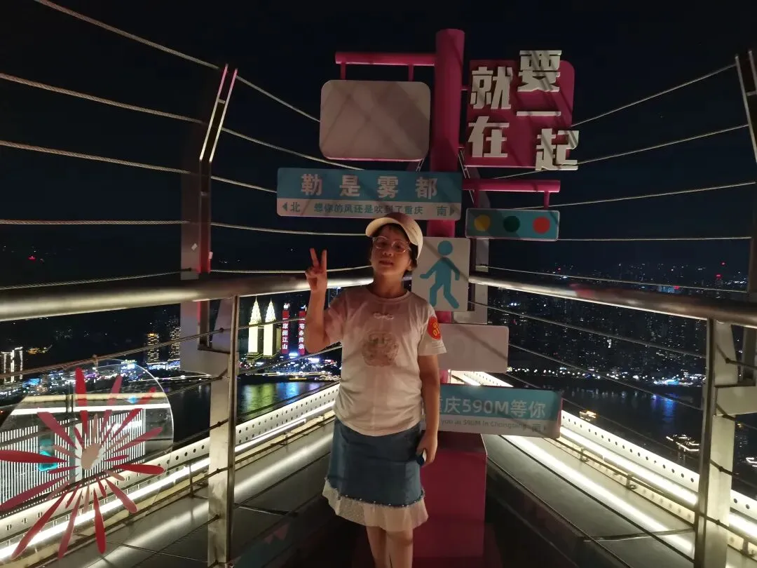打卡完轻轨穿楼,我们直奔观景台。“重庆WFC会仙楼观景台”,坐落于重庆市渝中区民族路188号环球金融中心73-75层,建筑高度339米,海拔达590米,是中国海拔最高的露天观景台之一。其融合了历史与现代元素,73层设有重庆老照片展览,展现城市变迁。75层露天设计可360度俯瞰两江交汇、解放碑商圈及山城立体夜景,被誉为“重庆之巅”。可惜在这里拍照时,73层隔着玻璃很局限,而在75层露天观景台拍照,景尚好,人却拍得不理想。不过我们重点是赏景,能360度看夜景,已是满足。
