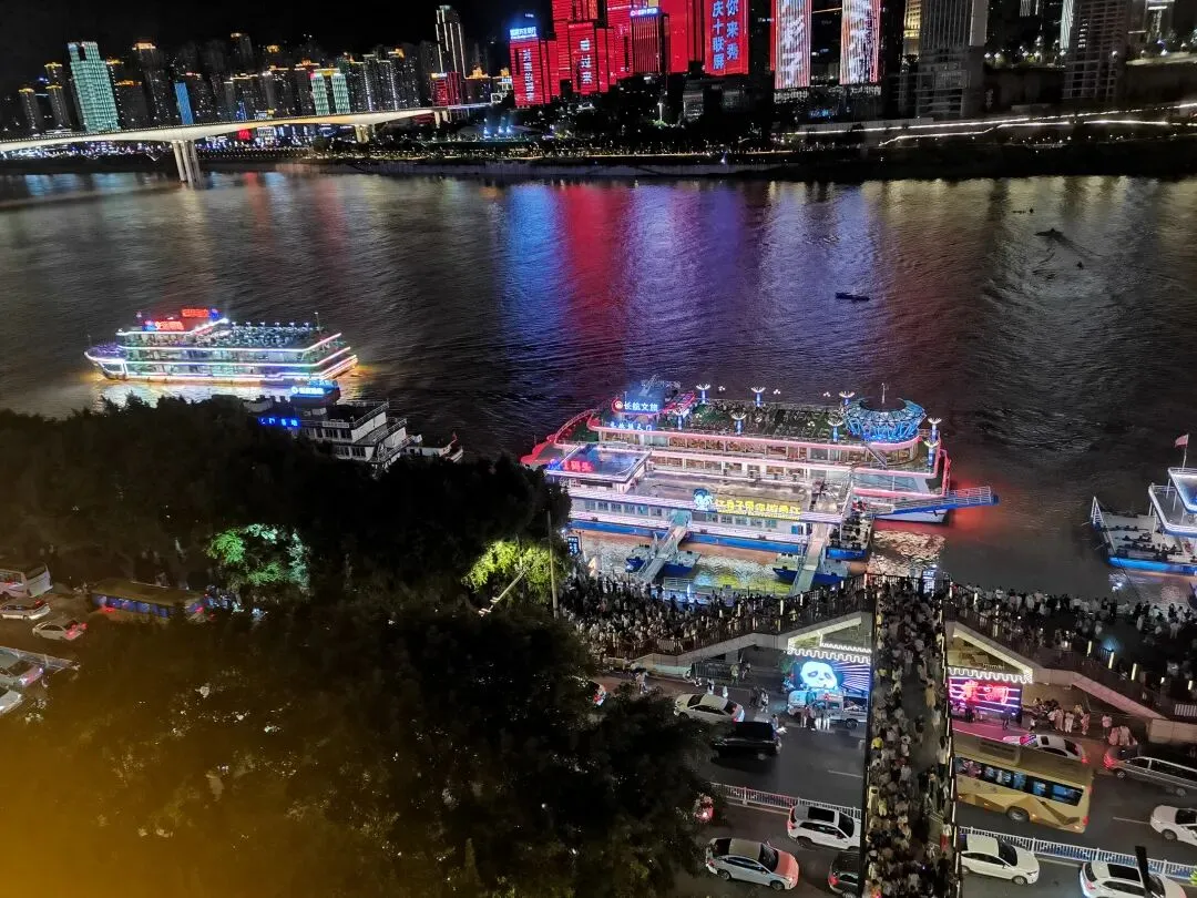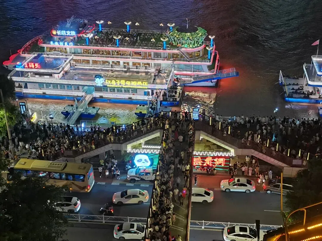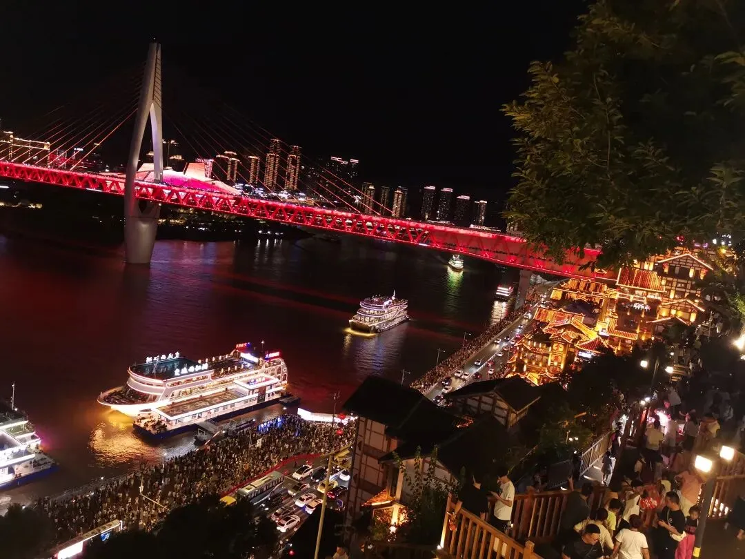 刚刚导航不灵,我便老办法——路在鼻子底下,问路。路人说,此时最热闹人最多的地方肯定是洪崖洞。果然如此,顺着人潮,依着大方向,不一会到得洪崖洞。真的是当之无愧的重庆头号网红地标,令人叹为观止!依山而建的吊脚楼建筑群,此时灯火辉煌,宛如现实版《千与千寻》中的汤屋,紧邻嘉陵江,与千厮门大桥交相辉映,其轮廓在夜色里勾出魔幻的曲线,让人分不清是现实还是动画场景。江里游船画舫,亦是灯火闪烁。这里人潮涌动,又集巴渝民俗、餐饮美食、观景娱乐于一体。简直像忽然闯进一场热烈的派对。