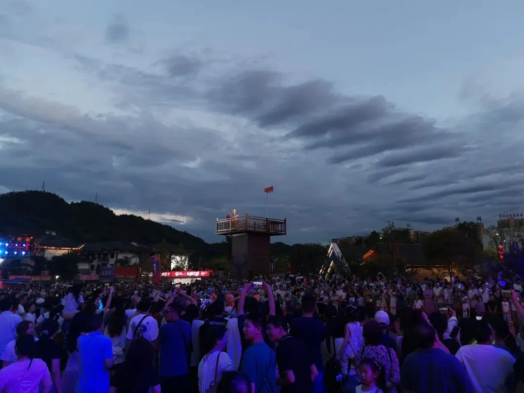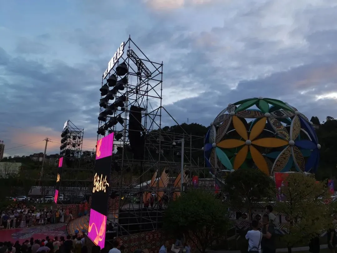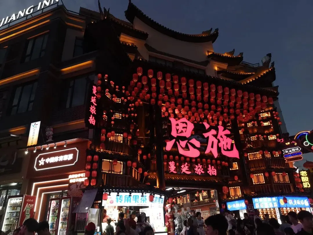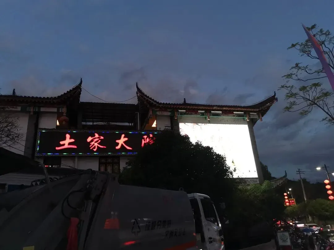 离开重庆的喧嚣,恩施是给心灵的留白。我们没有去看屏山峡谷绿得不像话的水和两岸直插云霄的峭壁;也没有去腾龙洞看大得能吞下一片云的洞口以及洞内的激光秀;连早就慕名的恩施大峡谷也放弃了,让其绝壁栈道和深不见底的峡谷留在想象中。我们直奔恩施女儿城和土司城,并在向晚到达女儿城。晚饭后看女儿城的女儿会演出。露天的演出很有少数民族特色。