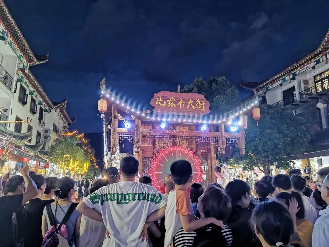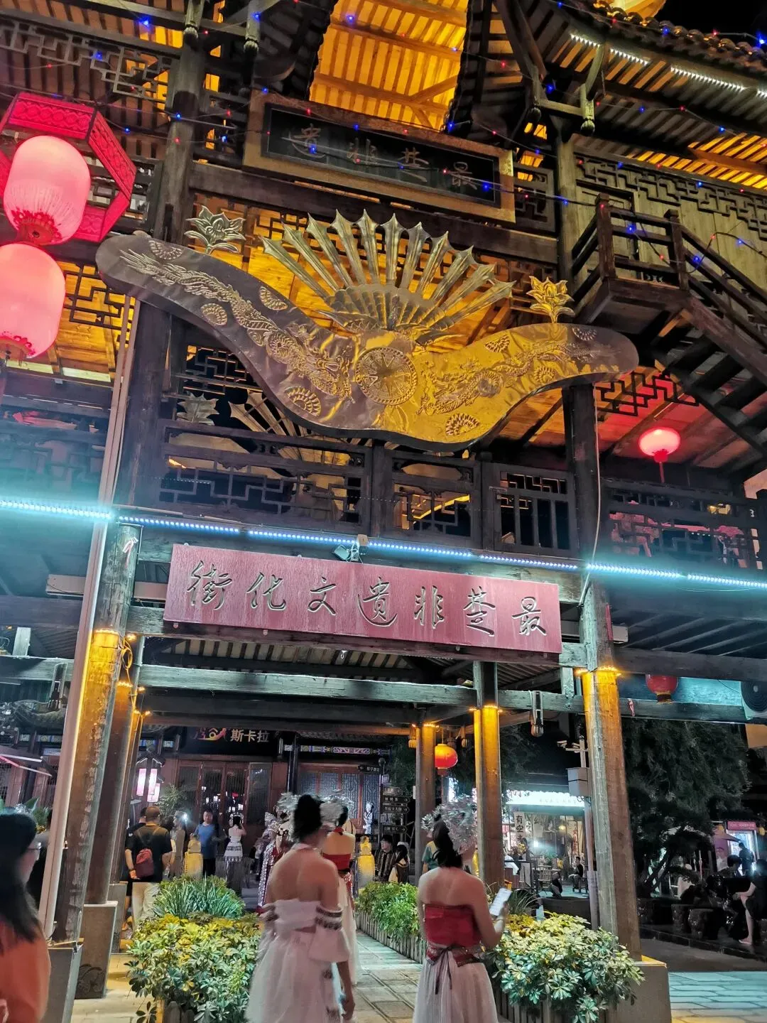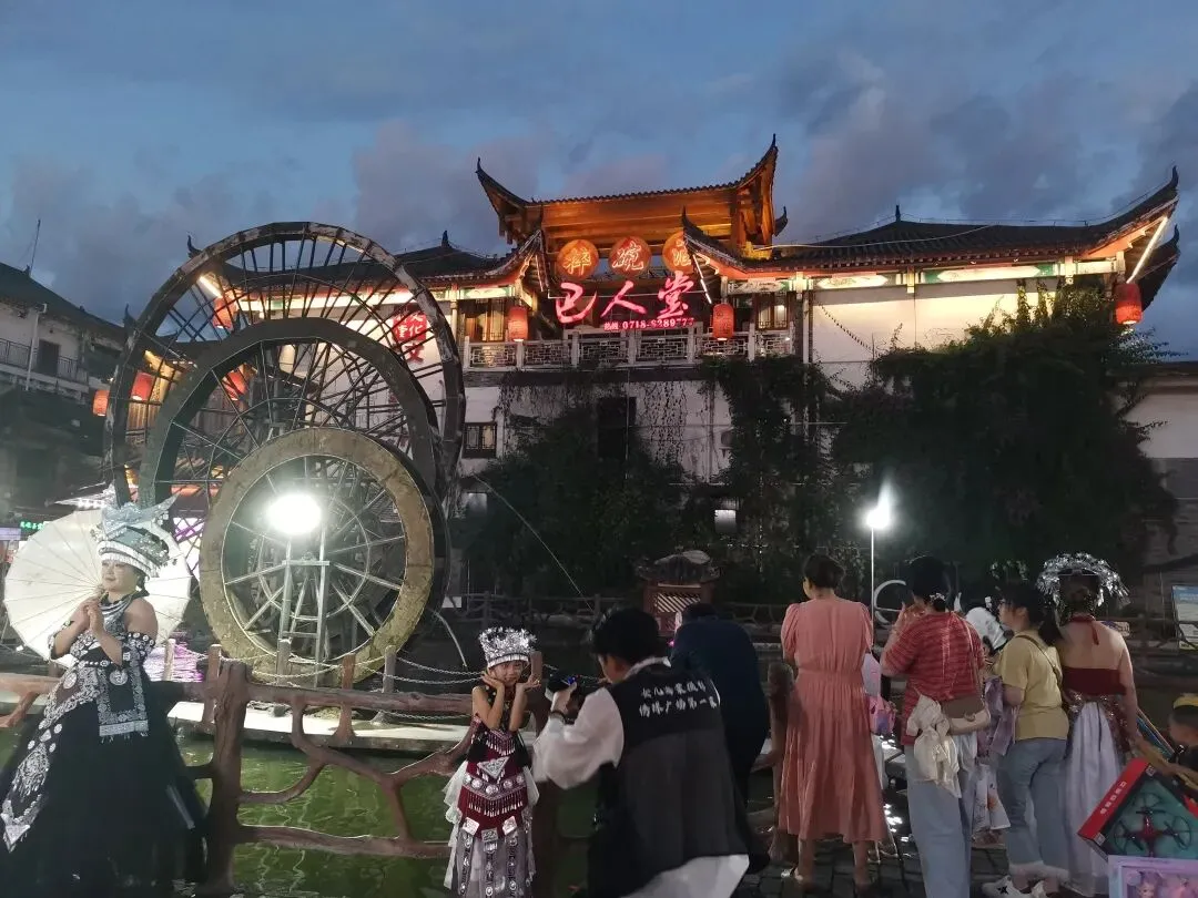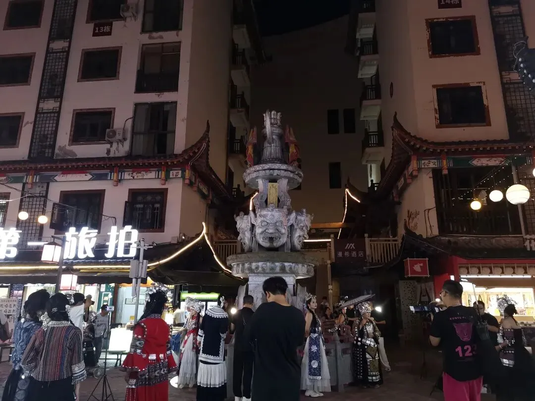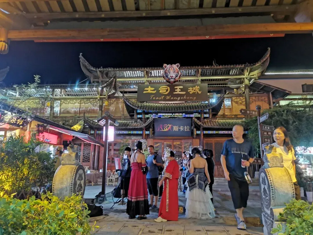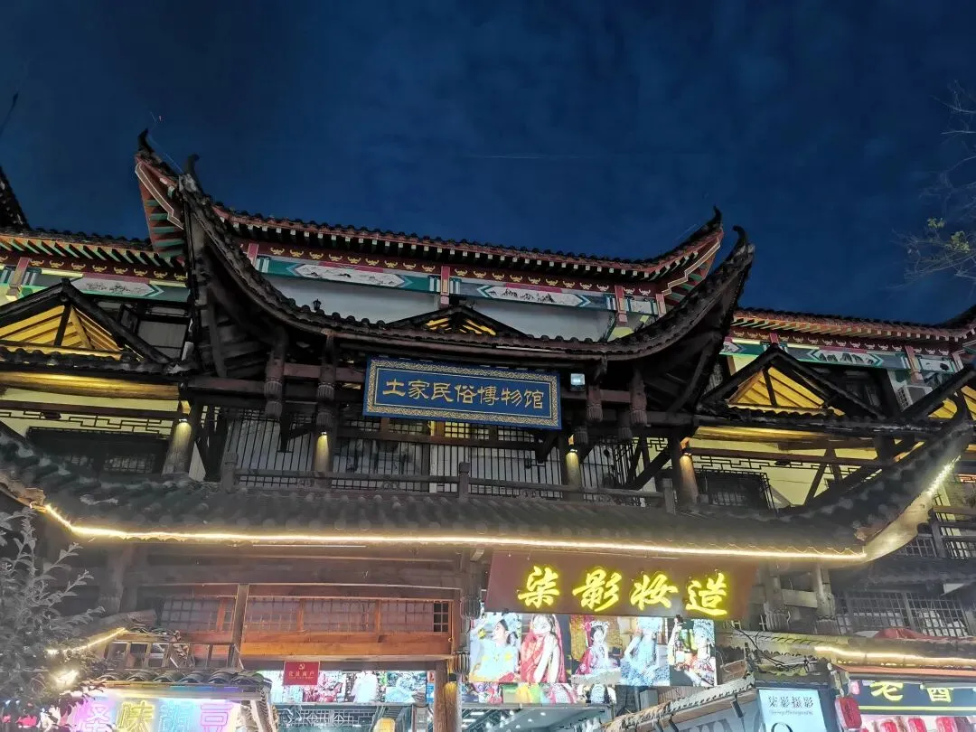 看完演出后逛女儿城夜景,了解这里虽商业化浓厚,但很有土家族特色的建筑。这里人流如织,每一个特色打卡处都有很多穿着银饰土家服装的女子或小孩在专业摄影师捕捉镜头中拍照。娟和源源及谭锦也去化妆拍照了。