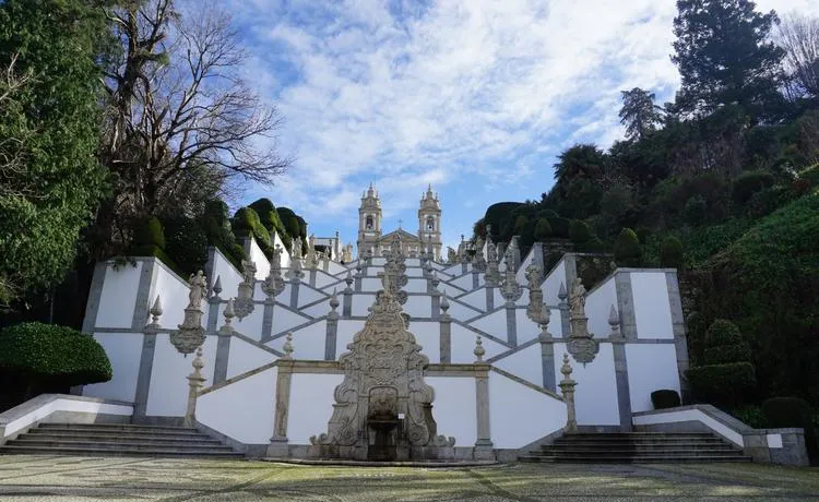 布拉加这个城市,它在葡萄牙北部,是全国的宗教中心,仁慈耶稣朝圣所在山上,要爬116米的巴洛克式阶梯才能到教堂,这阶梯不是直的,是之字形的,每一段代表一种美德,你爬的时候会觉得累,但这累是设计的一部分,因为朝圣本来就该是辛苦的,到了山顶,你回头看那个阶梯,白色的扶手、瓷砖装饰的喷泉、两边的雕塑,整个画面对称到让人觉得这是人类能创造出来的最工整的东西。